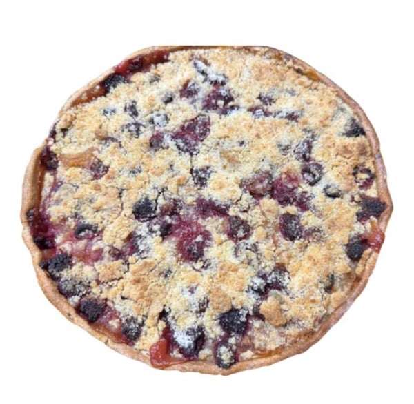 Pate sablé crème d'amande, morceaux de pommes, framboises & crumble